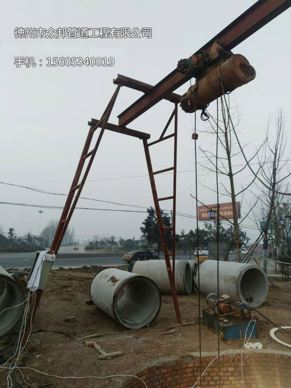 把水泥管道利用升降機進行下放到蓄水池底部,因為蓄水池面積限制,只能是頂管鋪設后后再進行下一個水泥管的運輸。